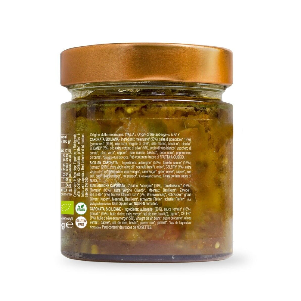 Aubergine* (50%), sauce tomate* (16%) (tomate* (95%), huile d'olive extra vierge*, sel marin, basilic*), oignon* (11%), céleri* (7%) , extra huile d'olive vierge* (5%), vinaigre de vin blanc*, sucre de canne*, olives vertes*, câpres*, fleur de sel, basilic*, poivre noir*, piment*.